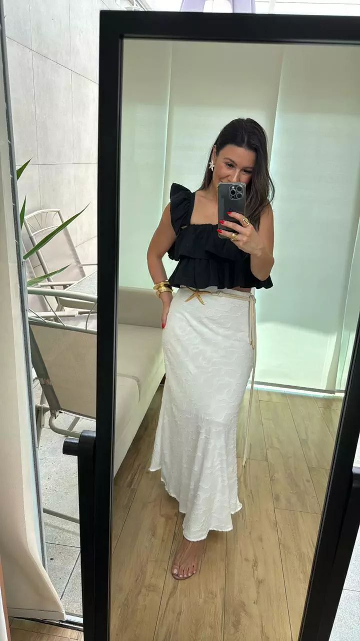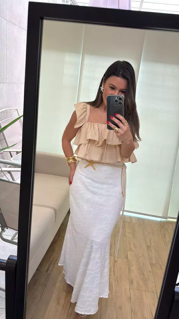 Na foto modelo está usando tamanho P , medidas da modelo: Altura 1.58 busto 89 , cintura 72 , quadril 101 cm .